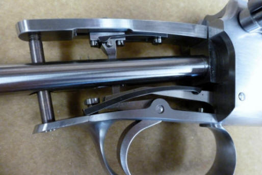 The Fraser rifles were originally made in the 1880's, by Daniel M. Fraser of Edinburg, Scotland. Chamberings were largely .303 British, but they were also made for .450-3-1/4", .450-400, .500-3", .500/450 Express, and similar. Probably less than 500 of these rifles were produced, and of course far fewer actually made it to the USA. The originals are considered to be of high quality and robust enough to handle smokeless pressures. This action has a vertical motion falling block with an internal hammer. The lever drops the breechblock to the load position, simultaneously cocking the hammer, then further downward movement activates the extractor. Both the sear engagement and the sear pressure are individually adjustable. The trigger pull can be easily set to a clean 2-3 lbs. The receiver, lever, upper tang and trigger plate are machined from solid 8620 steel. The breechblock opening is EDM wirecut. The various screws are machined from 1045 medium carbon steel, which can be heat-treated to reasonable strength without danger of brittleness. The hammer and sear are already hardened, and the springs are electropolished. The breechblock, mainspring hanger, trigger and safety parts are made from pre-hardened 4140. The stock bolt, firing pin bushing tool, and sear pin removal tool are provided with the action. New for 2019 - First, an "intercepting sear" - somewhat a misnomer - has been added. This mechanism actually intercepts the hammer fall, if the sear is jarred off while the safety is "on". Second, the extractor has been moved from 7:30 to 9 o'clock, to prevent slipping out from under small-rimmed cartridges. Finally, there is an option for a "bolted safety", as found on some original British rifles. The bolted safety adds $150 to the amended prices below. See picture. Actions will be in the white only. External parts will be hand-polished to a 400-grit finish, but final polishing, and any heat-treating or bluing, will be the responsibility of the customer. Price: $2645.00 Call or email for current delivery times. Left-hand action price: $3145.00 |